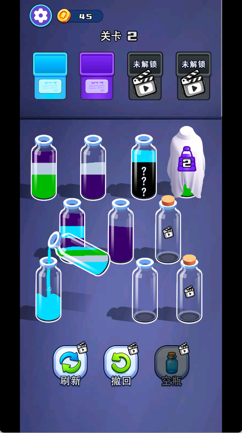 3、后期的关卡还是比较的难的,因为有些水我们是看不见颜色的,我们可以先将看的见的相同的倒在一起。