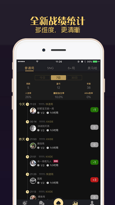 4、实时战绩,记录德州牌局内每一个玩家的赢取, 以备后续分析, 分享;